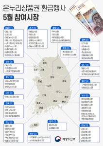 전국 63개 전통시장에서는 국산 수산물을 구매한 소비자들에게 구매금액에 따라 최대 2만 원까지 온누리상품권을 지급하는 ‘5월 온누리상품권 환급행사’가 개최된다.