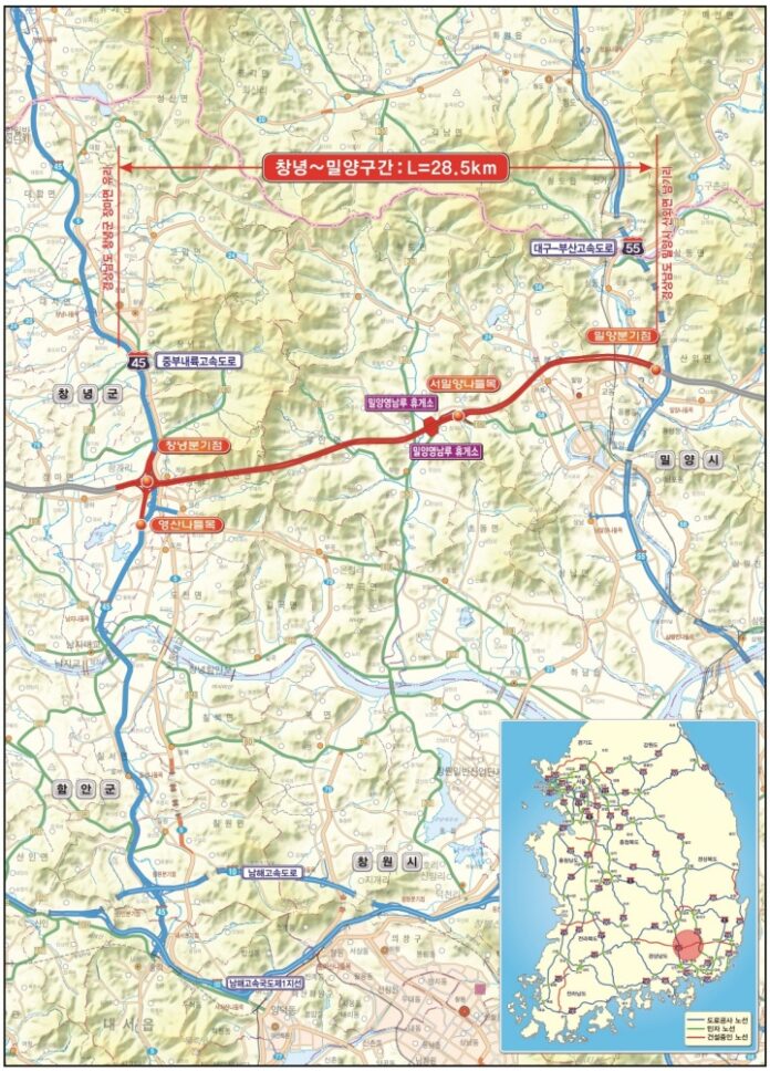 창녕-밀양 고속도로는 경남 창녕군 장마면에서 밀양시 산외면까지 28.5㎞로, 4차로 신설 구간이다.